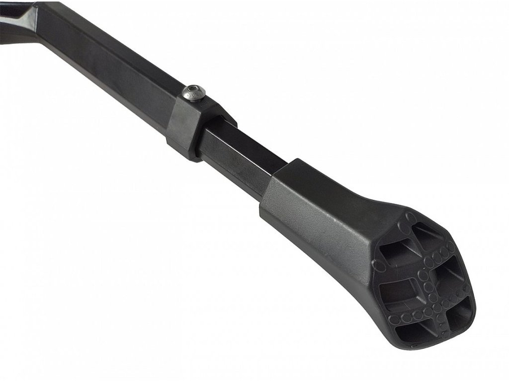 Zvětšený doraz poskytuje pevnou aretaci kliky, takže stojánek i v terénu zůstává pevně na svém místě a je absolutně tichý. Široká, přepracovaná patka s velkou styčnou plochou zajišťuje perfektní stabilitu a spolehlivě brání zaboření do měkkého povrchu.